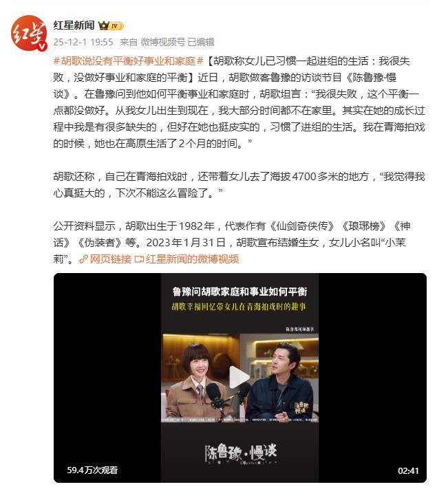 据12月1日报道,胡歌在访谈节目《陈鲁豫·慢谈》中的一番真情流露,瞬间戳中了无数职场父母的心。当被问及如何平衡事业与家庭时,这位一贯以沉稳形象示人的一线男星,竟用“我很失败”、“一点都没做好”来评价自己,坦言从女儿“小茉莉”出生至今,自己大部分时间都在外工作,对孩子的成长存在大量缺失。